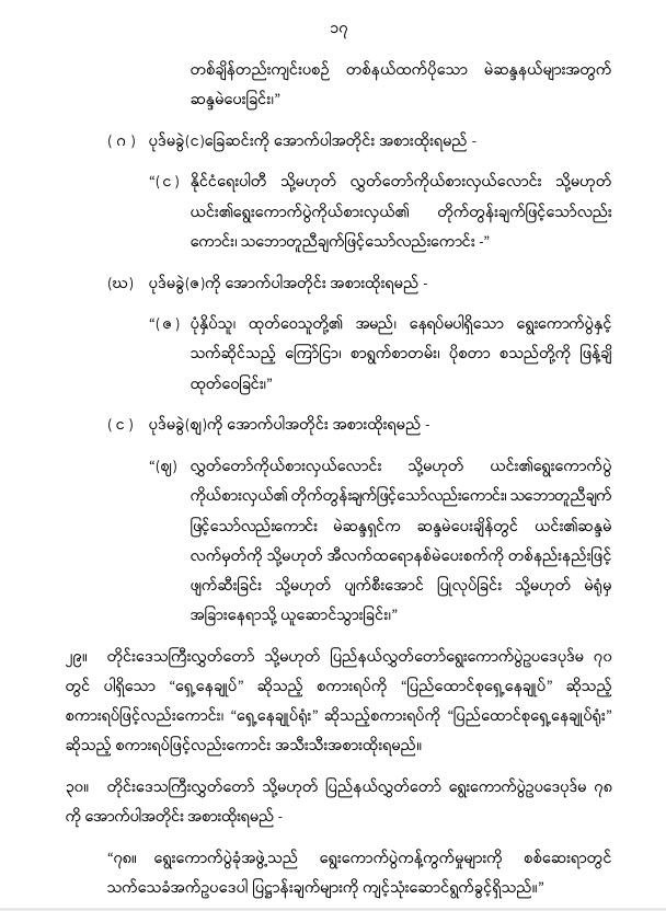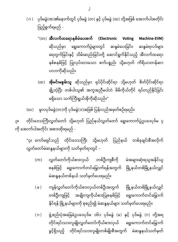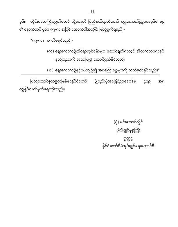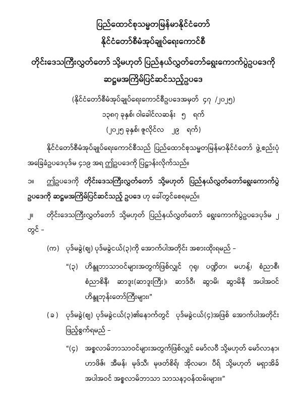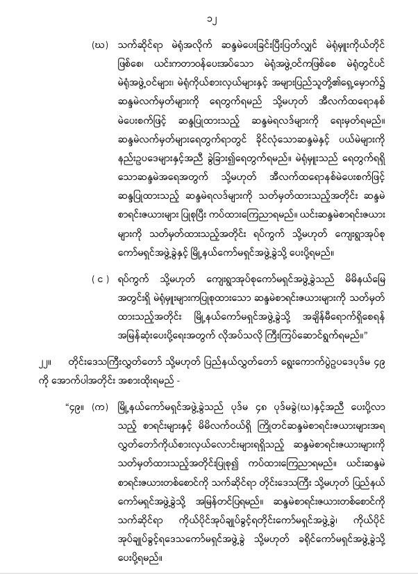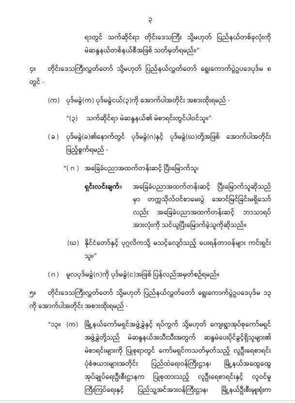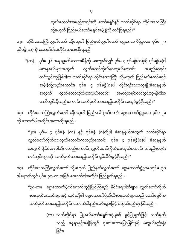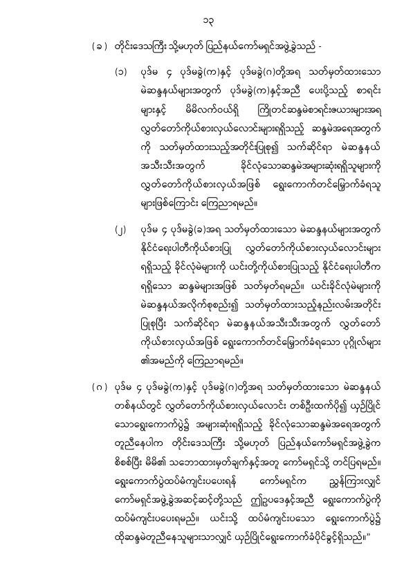 နိုင်ငံတော်စီမံအုပ်ချုပ်ရေးကောင်စီ ဥပဒေအမှတ် (၄၇ / ၂၀၂၅) ထုတ်ပြန်ခြင်း (၃၀-၇-၂၀၂၅) Post author:NSPNC Post published:July 30, 2025 Post category:ပြည်တွင်းရေးရာ / သတင်းများ ပြည်ထောင်စုသမ္မတမြန်မာနိုင်ငံတော် နိုင်ငံတော်စီမံအုပ်ချုပ်ရေးကောင်စီ တိုင်းဒေသကြီးလွှတ်တော် သိုမဟုတ် ပြည်နယ်လွှတ်တော် ရွေးကောက်ပွဲဥပဒေကို ဆဌမအကြိမ်ပြင်ဆင်သည့်ဥပဒေ (နိုင်ငံတော်စီမံအုပ်ချုပ်ရေးကောင်စီ ဥပဒေအမှတ် ၄၇ / ၂၀၂၅ ) ၁၃၈၇ ခုနှစ်၊ ဝါခေါင်လဆန်း ၅ ရက် ( ၂ဝ၂၅ နှစ်၊ ဇူလိုင်လ ၂၉ ရက် ) ကို အောက်ပါအတိုင်း ထုတ်ပြန်ခဲ့ပါသည်- မှီငြမ်း။ ပြန်ကြားရေးဝန်ကြီးဌာန Please Share This Share this content Opens in a new window Opens in a new window Opens in a new window Opens in a new window Opens in a new window Opens in a new window Opens in a new window Opens in a new window Opens in a new window Opens in a new window You Might Also Like နိုင်ငံတော်စီမံအုပ်ချုပ်ရေးကောင်စီ ဥပဒေအမှတ် (၄၅ / ၂၀၂၅) ထုတ်ပြန်ခြင်း (၃၀-၇-၂၀၂၅) July 30, 2025 နိုင်ငံတော်စီမံအုပ်ချုပ်ရေးကောင်စီဥက္ကဋ္ဌအား NCA (၈)နှစ်မြောက် နှစ်ပတ်လည်နေ့အခမ်းအနားသို့ တက်ရောက်ခဲ့သော RCSS ဥက္ကဋ္ဌ ဦးဆောင်သည့်အဖွဲ့မှ လာရောက် ဂါရဝပြုတွေ့ဆုံ January 3, 2024 မြန်မာ-ရုရှား စီးပွားရေးဖိုရမ်ကျင်းပ၊ နိုင်ငံတော်စီမံအုပ်ချုပ်ရေးကောင်စီဥက္ကဋ္ဌ ဖြည့်စွက်အမှာစကားပြောကြား (၅-၃-၂၀၂၅) March 6, 2025