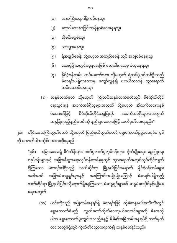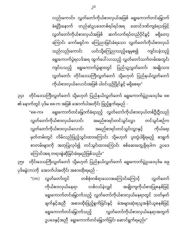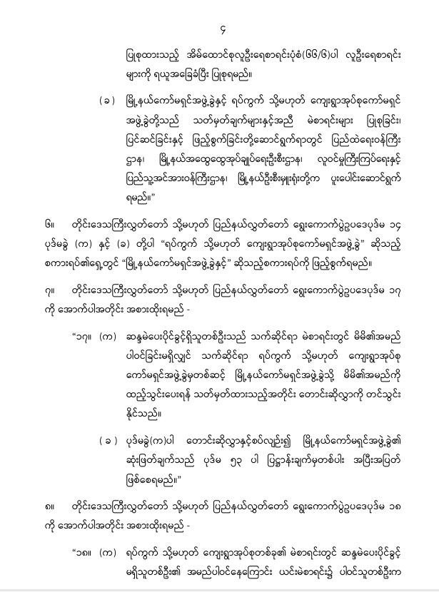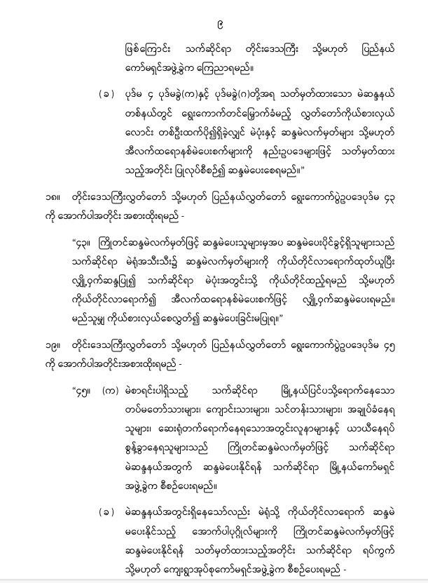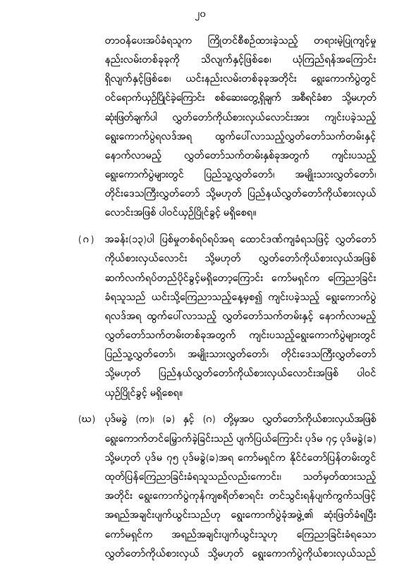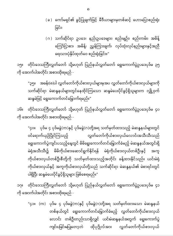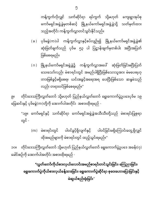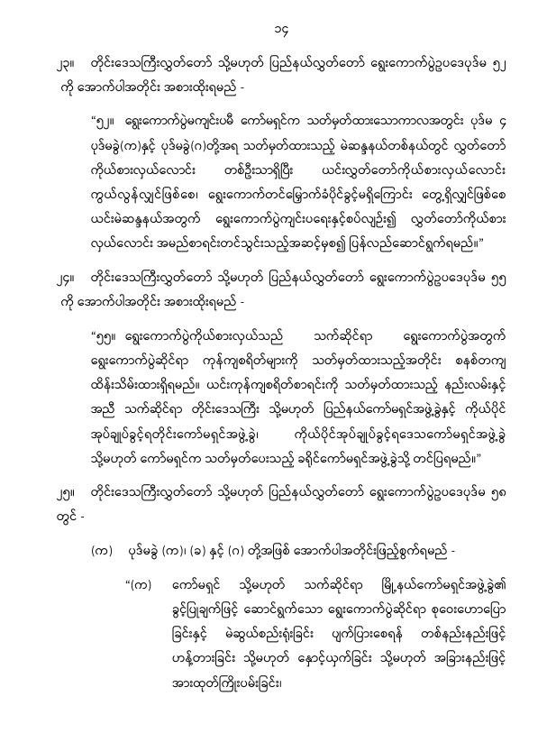 နိုင်ငံတော်စီမံအုပ်ချုပ်ရေးကောင်စီ ဥပဒေအမှတ် (၄၇ / ၂၀၂၅) ထုတ်ပြန်ခြင်း (၃၀-၇-၂၀၂၅) Post author:NSPNC Post published:July 30, 2025 Post category:ပြည်တွင်းရေးရာ / သတင်းများ ပြည်ထောင်စုသမ္မတမြန်မာနိုင်ငံတော် နိုင်ငံတော်စီမံအုပ်ချုပ်ရေးကောင်စီ တိုင်းဒေသကြီးလွှတ်တော် သိုမဟုတ် ပြည်နယ်လွှတ်တော် ရွေးကောက်ပွဲဥပဒေကို ဆဌမအကြိမ်ပြင်ဆင်သည့်ဥပဒေ (နိုင်ငံတော်စီမံအုပ်ချုပ်ရေးကောင်စီ ဥပဒေအမှတ် ၄၇ / ၂၀၂၅ ) ၁၃၈၇ ခုနှစ်၊ ဝါခေါင်လဆန်း ၅ ရက် ( ၂ဝ၂၅ နှစ်၊ ဇူလိုင်လ ၂၉ ရက် ) ကို အောက်ပါအတိုင်း ထုတ်ပြန်ခဲ့ပါသည်- မှီငြမ်း။ ပြန်ကြားရေးဝန်ကြီးဌာန Please Share This Share this content Opens in a new window Opens in a new window Opens in a new window Opens in a new window Opens in a new window Opens in a new window Opens in a new window Opens in a new window Opens in a new window Opens in a new window You Might Also Like နိုင်ငံတော်စီမံအုပ်ချုပ်ရေးကောင်စီ ဥပဒေအမှတ် (၄၅ / ၂၀၂၅) ထုတ်ပြန်ခြင်း (၃၀-၇-၂၀၂၅) July 30, 2025 နိုင်ငံတော်စီမံအုပ်ချုပ်ရေးကောင်စီဥက္ကဋ္ဌအား NCA (၈)နှစ်မြောက် နှစ်ပတ်လည်နေ့အခမ်းအနားသို့ တက်ရောက်ခဲ့သော RCSS ဥက္ကဋ္ဌ ဦးဆောင်သည့်အဖွဲ့မှ လာရောက် ဂါရဝပြုတွေ့ဆုံ January 3, 2024 မြန်မာ-ရုရှား စီးပွားရေးဖိုရမ်ကျင်းပ၊ နိုင်ငံတော်စီမံအုပ်ချုပ်ရေးကောင်စီဥက္ကဋ္ဌ ဖြည့်စွက်အမှာစကားပြောကြား (၅-၃-၂၀၂၅) March 6, 2025