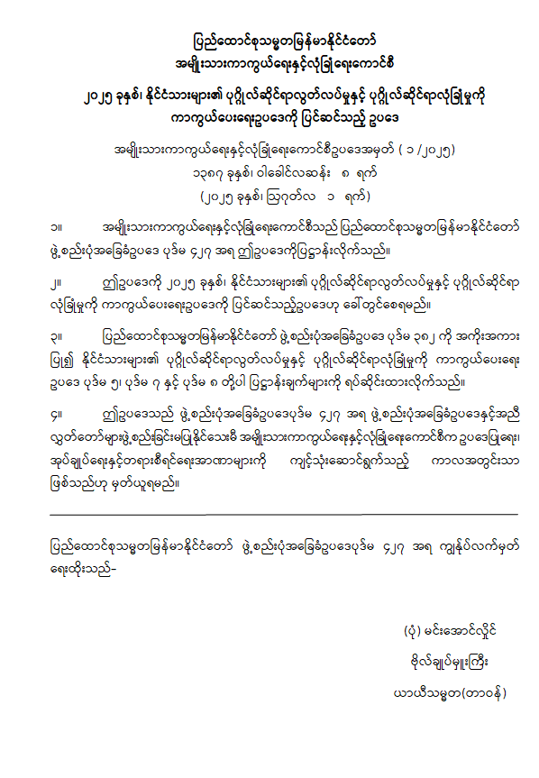 ၂၀၂၅ ခုနှစ်၊ နိုင်ငံသားများ၏ ပုဂ္ဂိုလ်ဆိုင်ရာလွတ်လပ်မှုနှင့် ပုဂ္ဂိုလ်ဆိုင်ရာလုံခြုံမှုကို ကာကွယ်ပေးရေးဥပဒေကို ပြင်ဆင်သည့် ဥပဒေထုတ်ပြန်ခြင်း (၁-၈-၂၀၂၅) Post author:NSPNC Post published:August 4, 2025 Post category:ပြည်တွင်းရေးရာ / သတင်းများ ပြည်ထောင်စုသမ္မတမြန်မာနိုင်ငံတော် အမျိုးသားကာကွယ်ရေးနှင့်လုံခြုံရေးကောင်စီ ၂၀၂၅ ခုနှစ်၊ နိုင်ငံသားများ၏ ပုဂ္ဂိုလ်ဆိုင်ရာလွတ်လပ်မှုနှင့် ပုဂ္ဂိုလ်ဆိုင်ရာလုံခြုံမှုကို ကာကွယ်ပေးရေးဥပဒေကို ပြင်ဆင်သည့် ဥပဒေကို အောက်ပါအတိုင်း ထုတ်ပြန်ခဲ့သည်- မှီငြမ်း။ ပြန်ကြားရေးဝန်ကြီးဌာန Please Share This Share this content Opens in a new window Opens in a new window Opens in a new window Opens in a new window Opens in a new window Opens in a new window Opens in a new window Opens in a new window Opens in a new window Opens in a new window You Might Also Like နိုင်ငံတော်စီမံအုပ်ချုပ်ရေးကောင်စီဥက္ကဋ္ဌ ပြည်ထောင်စုသမ္မတမြန်မာနိုင်ငံတော် လုံခြုံရေး၊ တည်ငြိမ်အေးချမ်းရေးနှင့် တရားဥပဒေစိုးမိုးရေး ကော်မတီအစည်းအဝေးအမှတ်စဉ် (၁/၂၀၂၄) သို့ တက်ရောက်အမှာစကားပြောကြား (၂၆-၁-၂၀၂၄) January 27, 2024 မတရားအသင်းအဖြစ် ကြေညာခြင်း (၂၈-၈-၂၀၂၅) August 29, 2025 အမျိုးသားကာကွယ်ရေးနှင့် လုံခြုံရေးကောင်စီ အစည်းအဝေး(၁/၂၀၂၄) ကျင်းပ January 31, 2024