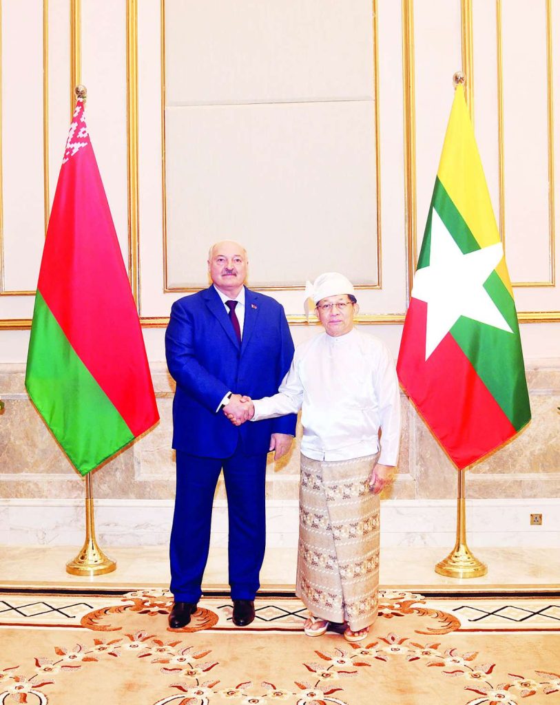 ပြည်ထောင်စုသမ္မတမြန်မာနိုင်ငံတော်ယာယီသမ္မတ နိုင်ငံတော်လုံခြုံရေးနှင့်အေးချမ်းသာယာရေးကော်မရှင်ဥက္ကဋ္ဌ ဗိုလ်ချုပ်မှူးကြီး မင်းအောင်လှိုင်သည် မြန်မာနိုင်ငံသို့ တရားဝင်ချစ်ကြည်ရေးခရီး ရောက်ရှိလာသော ဘယ်လာရုစ်သမ္မတနိုင်ငံသမ္မတ H.E. Mr. Aleksandr Lukashenko အား ၂၈-၁၁-၂၀၂၅ ရက် နံနက်ပိုင်းတွင် သမ္မတအိမ်တော် ဆင်ဖြူတော်ဆောင်ဧည့်ခန်းမ၌ ဂုဏ်ပြုတပ်ဖွဲ့ဖြင့် ကြိုဆိုသည်။